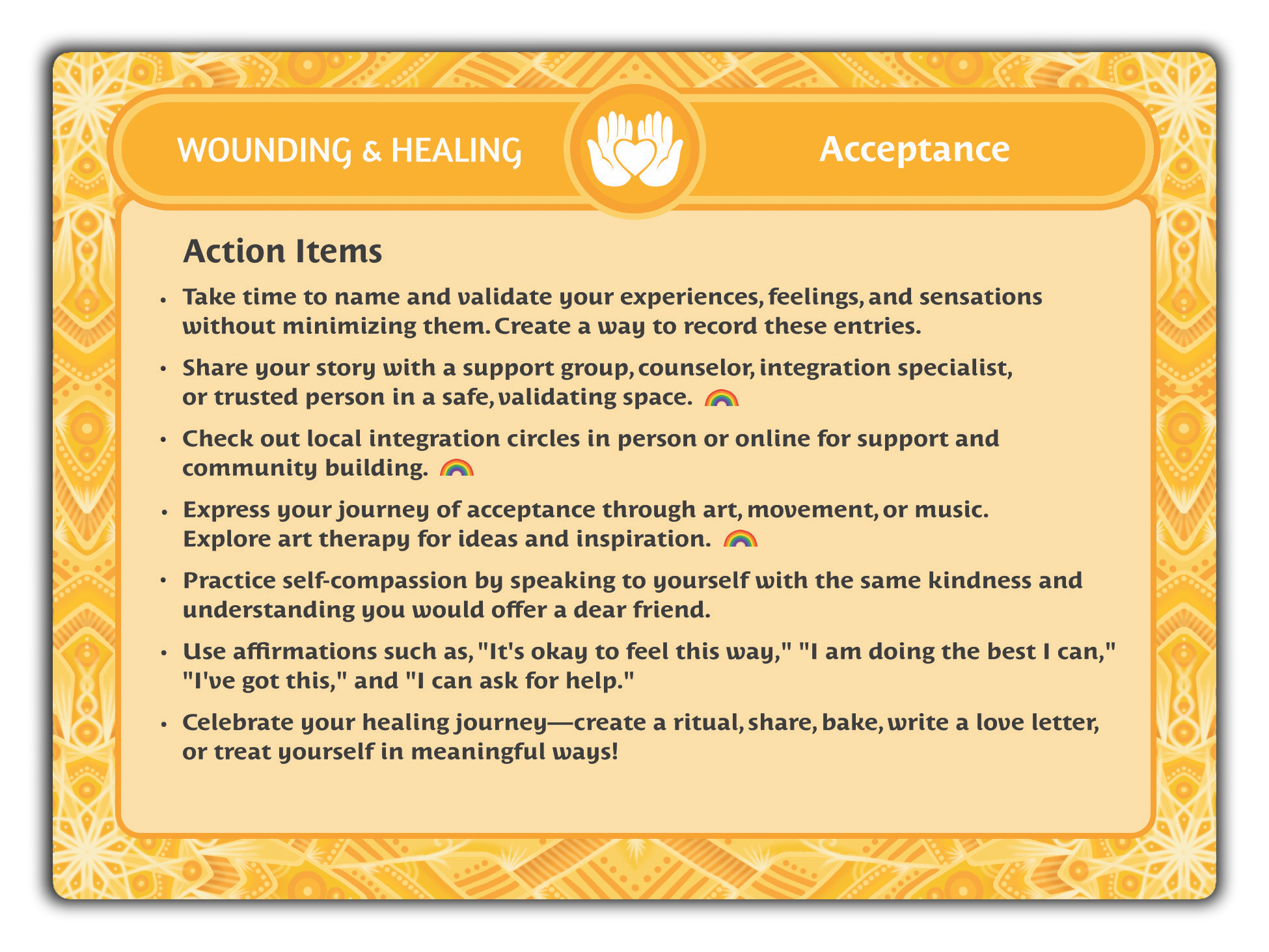 After a psychedelic experience, work with one or more cards at your own pace. Your personal Action Items may unfold over weeks, months, or even years.